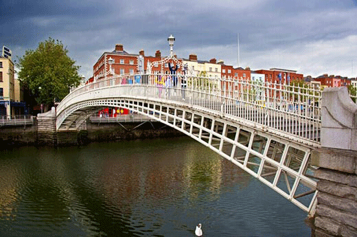 該橋建由Irishenco建設(shè),使用預(yù)制鋼結(jié)構(gòu)來自貝爾法斯特的哈蘭德與沃爾夫。這座橋被命名為都柏林著名作家詹姆斯·喬伊斯,2003(布魯姆)6月16日通車。喬伊斯的短篇小說“死者”設(shè)置在15號迎來島,房子面臨橋的南側(cè)。