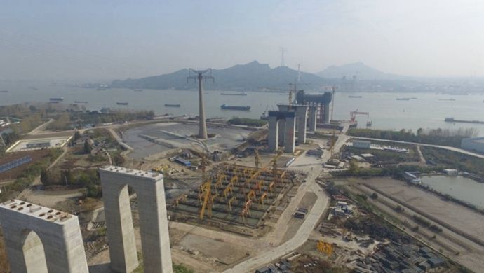 五峰山長江特大橋位于泰州長江大橋和潤揚(yáng)長江大橋之間,其北岸位于鎮(zhèn)江市丹徒區(qū)高橋鎮(zhèn),南岸位于鎮(zhèn)江新區(qū)五峰山腳下,是連鎮(zhèn)鐵路和京滬高速公路南延的關(guān)鍵控制性工程。大橋全長6409米,其中主跨為1092米,采用單跨懸吊鋼桁梁懸索結(jié)構(gòu),上層為8車道高速公路,設(shè)計(jì)速度每小時(shí)100公里;下層為4線高速鐵路,設(shè)計(jì)速度每小時(shí)250公里。