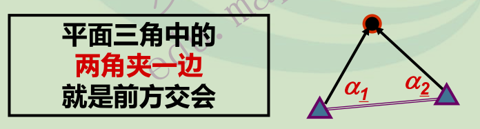 在測量中:前方交會是在兩個(gè)已知點(diǎn)1、2上,安置經(jīng)緯儀,對未知點(diǎn)A測定水平角、垂直角,就能測得未知點(diǎn)坐標(biāo)A(X、Y、Z)。