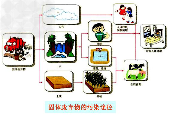 固體廢物特別是有害固體廢物能通過(guò)不同途徑危害人體健康。通常,工礦業(yè)固體廢物所含化學(xué)成分能形成化學(xué)物質(zhì)型污染、人畜糞便和生活垃圾能形成病原體型污染。
