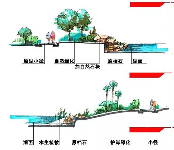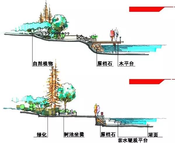 駁岸的植物配置很重要,既能使岸上的景色和水融為一體,又對(duì)水面空間的景觀起著主導(dǎo)的作用。駁岸一般分為土岸,石岸,混凝土岸等等,自然的或規(guī)則的。