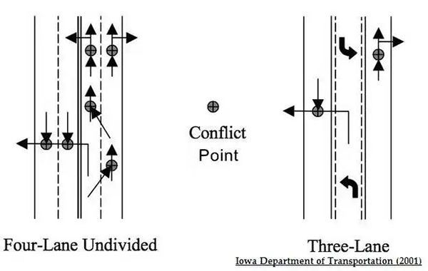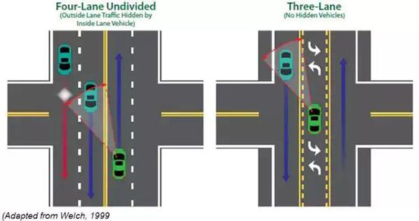 在美國,道路瘦身的形式是將傳統(tǒng)的雙向四車道改造為帶有中央左轉(zhuǎn)專用道的三車道道路,當(dāng)然還可以通過三車道改造為兩車道、自行車道改造為隔離式(受保護(hù))的自行車專用道、減少寬街道的車道寬度等方式進(jìn)行「道路瘦身」工程。