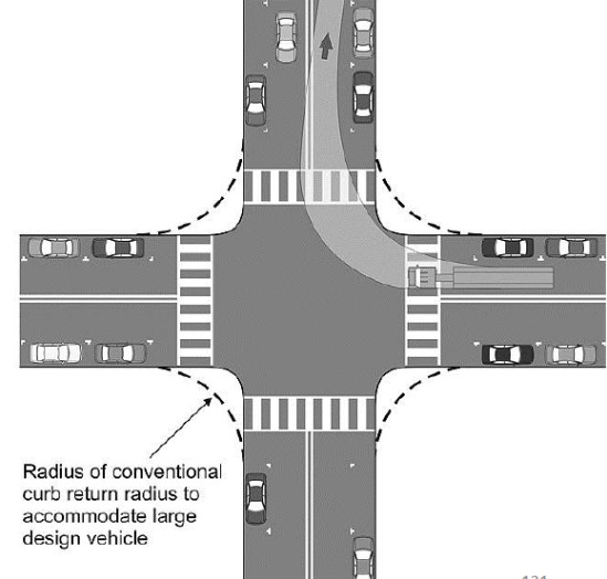 車輛轉(zhuǎn)彎都會形成內(nèi)輪差和外輪差,對其他用路人形成威脅。因此,在小半徑轉(zhuǎn)彎中,應(yīng)對該交叉口的所有用路人進行流線分析,并據(jù)此形成必要的隔離和控制,確保安全。在美國的規(guī)范里,交叉口的轉(zhuǎn)彎半徑,即便直角也是可行的,但要有一大堆方法解決不同用路人的轉(zhuǎn)彎。如果僅僅縮小轉(zhuǎn)彎半徑,而沒有針對用路人做必要轉(zhuǎn)彎流線優(yōu)化,并有必要的控制措施,會極大的增加風(fēng)險,并降低交叉口的容量。因此,形成小半徑彎道,不在于彎道半徑是多少,而在于如何確保安全和容量。圖片來源:徐耀賜/交叉口設(shè)計