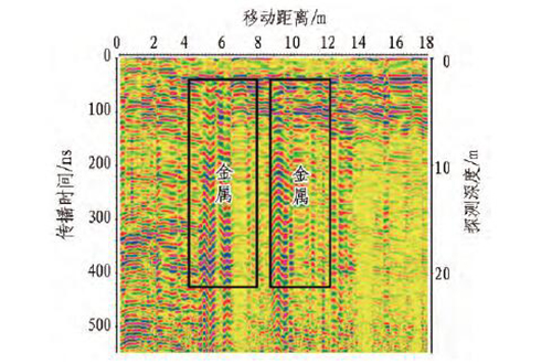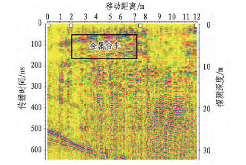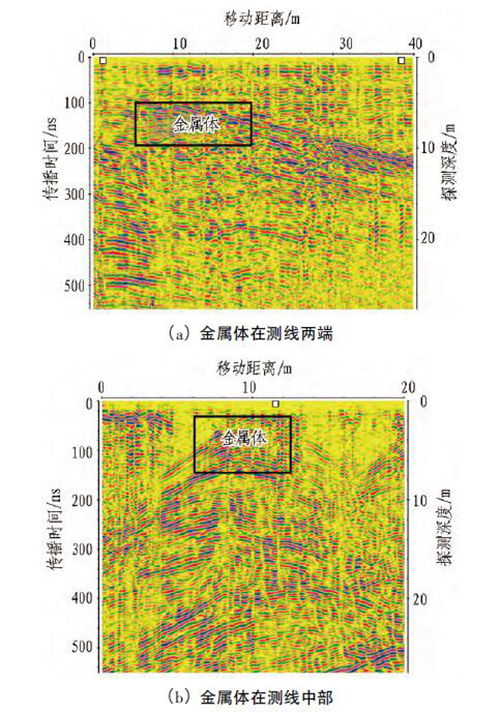 1) 地質(zhì)雷達(dá)探測(cè)時(shí)需將金屬物體移至測(cè)線外一定距離。對(duì)于會(huì)對(duì)探測(cè)結(jié)果產(chǎn)生干擾又無(wú)法移走的干擾體,應(yīng)詳細(xì)記錄其相關(guān)信息,包括干擾體的屬性與大小以及干擾體與測(cè)線的相對(duì)位置關(guān)系等,并通過(guò)信號(hào)處理從雷達(dá)圖像上識(shí)別或剔除干擾波,降低誤判率。