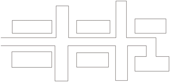 道路主要平行于主要建筑、構(gòu)筑物,圍繞各庫房進(jìn)行布置,這種道路布置形式受地形條件限制,一般不宜在山區(qū)丘陵地區(qū)采用,且道路的總長度及占地較多,對(duì)于交通繁忙、車流和人流組織需要分離的采用,如圖所示。