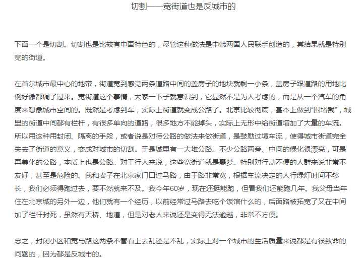 標(biāo)題上看,談的城市設(shè)計(jì),其實(shí)更多是針對(duì)城市問題,之所以起個(gè)標(biāo)題叫城市設(shè)計(jì),其實(shí)是旨在能進(jìn)入城市設(shè)計(jì)領(lǐng)域有所建樹,這個(gè)無可厚非,這樣標(biāo)題必定能引來建筑從業(yè)人員的共鳴,來實(shí)現(xiàn)從業(yè)領(lǐng)域的拓展。然,文我也略微仔細(xì)的讀了一下,談了蠻多觀點(diǎn)。要么都是老生常談