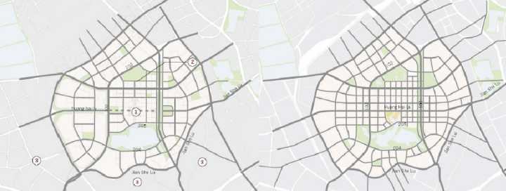 且不說標(biāo)題的錯(cuò)誤,街道和道路本來就是兩個(gè)意思,而其實(shí)他想表達(dá)的意思是道路。切割城市的道路也要看區(qū)域,看尺度,一味否定絕對(duì)不是正確的觀點(diǎn)。而這樣的思考,多少年前,城市設(shè)計(jì)的實(shí)踐領(lǐng)域也早已出現(xiàn)。何況道路和人其實(shí)不是對(duì)立的(下圖來自[SOM][2008]武漢王家墩商務(wù)核心區(qū)設(shè)計(jì)規(guī)劃方案,比較城市設(shè)計(jì)前后的路網(wǎng)密度)