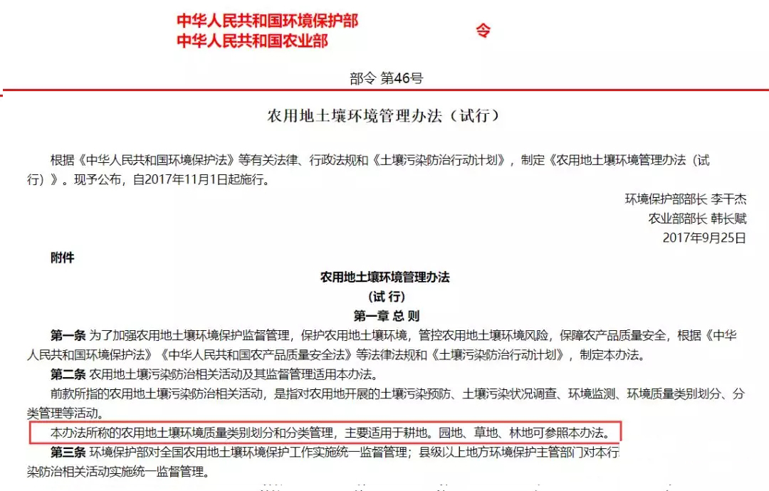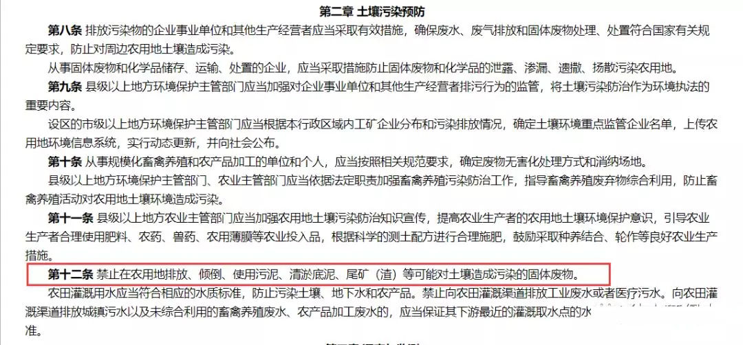 在該標(biāo)準(zhǔn)發(fā)布之前,環(huán)保部和農(nóng)業(yè)部于2017年9月25日聯(lián)合發(fā)布了《農(nóng)用地土壤環(huán)境管理辦法(試行)》(環(huán)境保護(hù)部、農(nóng)業(yè)部令 第46號),自2017年11月1日起施行。該辦法第二條第三款規(guī)定:“本辦法所稱的農(nóng)用地土壤環(huán)境質(zhì)量類別劃分和分類管理,主要適用于耕地。園地、草地、林地可參照本辦法。”同時,該辦法第十二條第一款規(guī)定:“禁止在農(nóng)用地排放、傾倒、使用污泥、清淤底泥、尾礦(渣)等可能對土壤造成污染的固體廢物。"看到這里小伙伴們是不是有點蒙了,一個是強(qiáng)制性國家標(biāo)準(zhǔn),一個是部門規(guī)章,一個說只要滿足要求就可以用,另一個卻說禁止用。