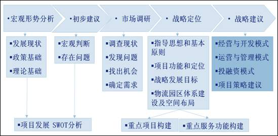 我們根據(jù)多年的工作經(jīng)驗(yàn),總結(jié)了自己使用的物流園區(qū)項(xiàng)目戰(zhàn)略規(guī)劃和定位研究的一般方法論(如下圖所示),并要做好以下工作: