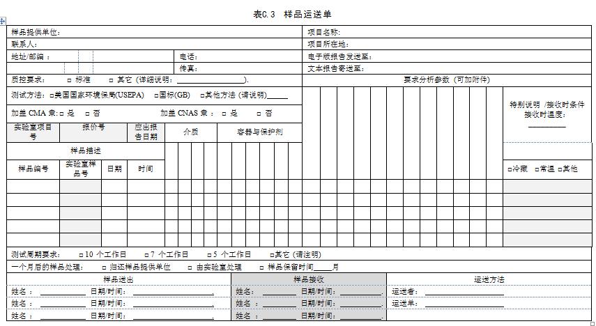 每份樣品從采樣到送至實驗室都應該有一個完整的樣品追蹤監(jiān)管程序,主要包括:樣品的收集、運輸、處理和相關(guān)人員的信息;樣品采集日期、時間、深度等記錄數(shù)據(jù);樣品分析項目等其他信息。樣品流轉(zhuǎn)清單樣式可參考表C.3。