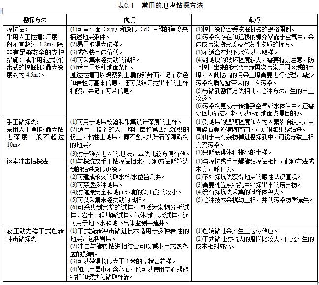 用于地塊環(huán)境評價的鉆探技術(shù)需結(jié)合地塊所在地區(qū)的地層條件、地塊鉆探的作業(yè)條件和地塊勘察的方案要求來選擇經(jīng)濟有效的鉆探方法。表C.1列出北京市地塊環(huán)境評價中的常用的鉆探方法及其優(yōu)缺點。