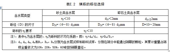 礫料的礫徑,應根據(jù)含水層顆粒篩分數(shù)據(jù)確定,可參照表E.2選用。