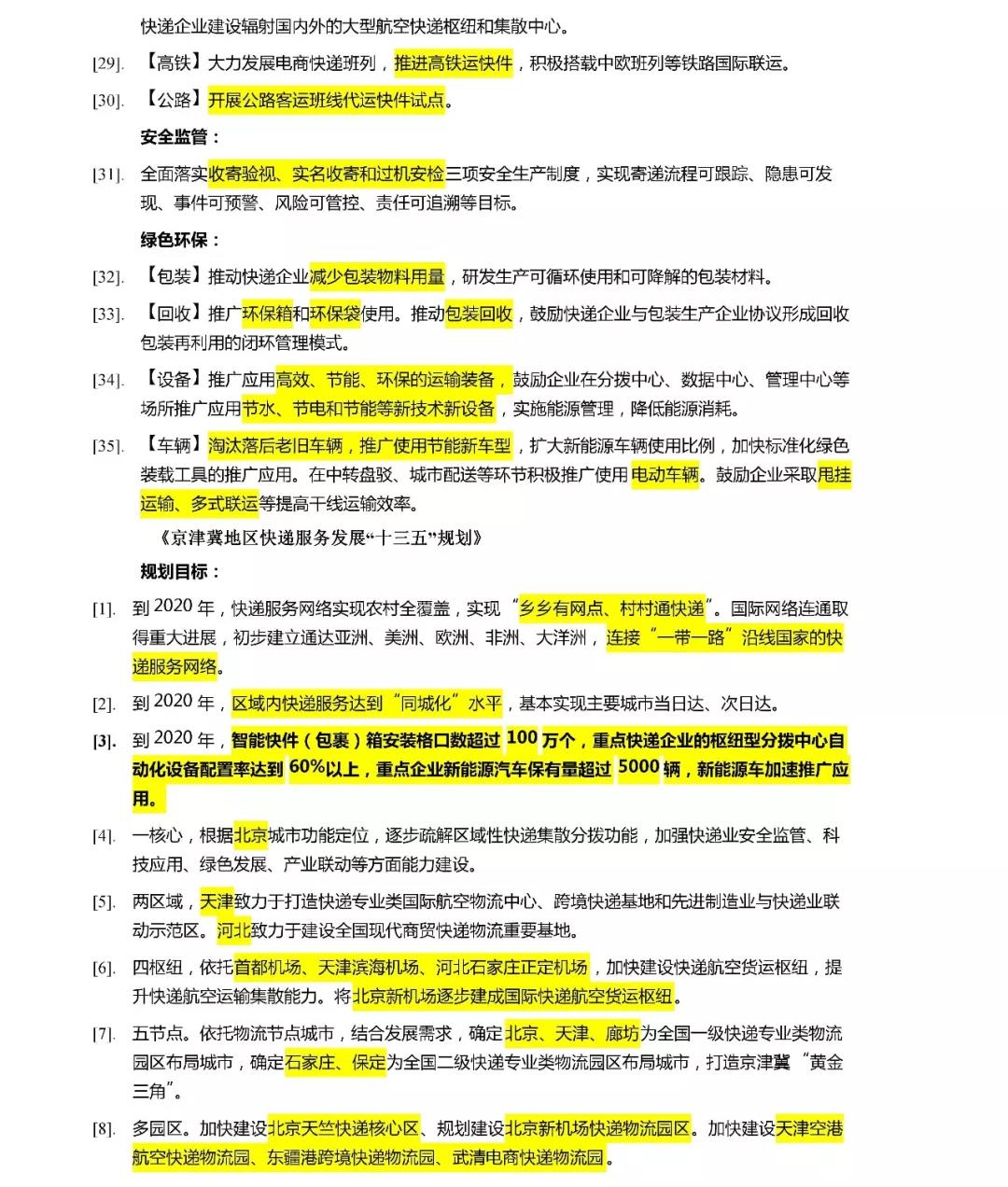 (3)到2020年,京津翼地區(qū),智能快件(包裹)箱安裝格口數(shù)超過100萬(wàn)個(gè),重點(diǎn)快遞企業(yè)的樞紐型分撥中心自動(dòng)化設(shè)備配置率達(dá)到60%以上,重點(diǎn)企業(yè)新能源汽車保有量超過5000輛,新能源車加速推廣應(yīng)用。