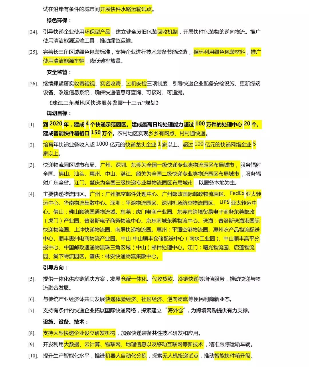 (5)到2020年,珠三角地區(qū),建成4個(gè)快遞示范園區(qū)。建成最高日均處理能力超過100萬(wàn)件的處理中心20個(gè)。建成智能快件箱格口150萬(wàn)個(gè)。