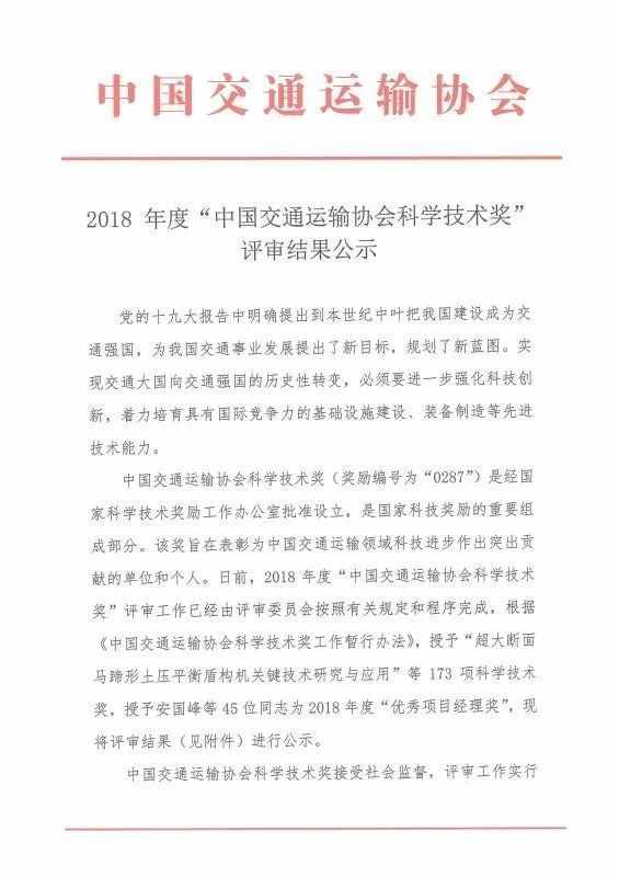 2018 年度中國交通運(yùn)輸協(xié)會科學(xué)技術(shù)獎獲獎項目名單