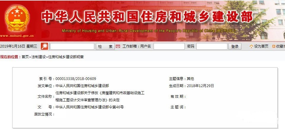 《住房和城鄉(xiāng)建設部關于修改<房屋建筑和市政基礎設施工程施工圖設計文件審查管理辦法>的決定》已經(jīng)2018年12月13日第5次部常務會議審議通過,現(xiàn)予發(fā)布,自發(fā)布之日起施行。