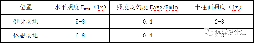 ?。?)健身場地照明要有足夠的水平照度和垂直照度,同時要有足夠的均勻度。休閑場地照明應滿足交流、觀賞和安全需求。見表3-2。