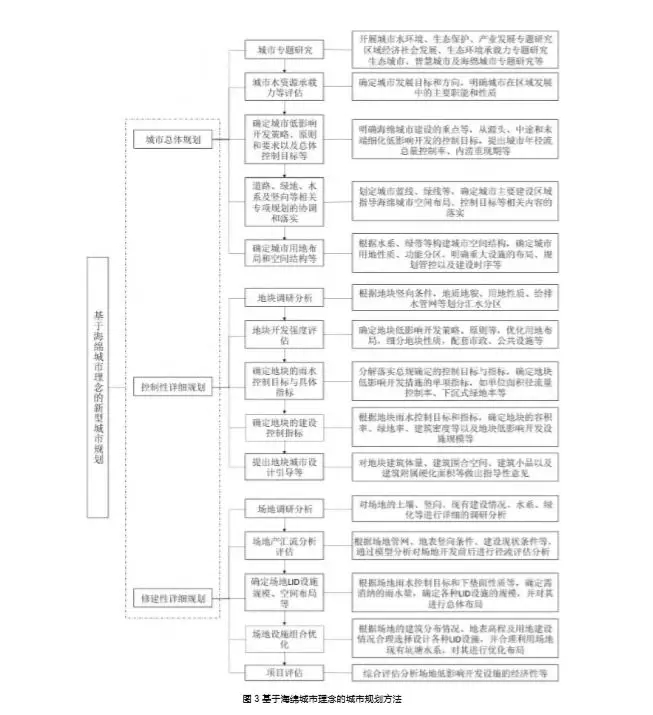 海綿城市建設是一個復雜的系統(tǒng),其建設應從城市 規(guī)劃的源頭著手,將海綿城市理念融入到城市各層級規(guī) 劃中,涉及到規(guī)劃、園林、水利、市政、道路等多部門、多專業(yè)之間的相互協調運作。海綿城市理念下的新型城市規(guī)劃方法對設計人員的要求已遠遠超過了傳統(tǒng)城市規(guī)劃專業(yè),主要體現在它需要多規(guī)合一,即強調不同專業(yè)和部門的協調運作;區(qū)域規(guī)劃,即強調城鄉(xiāng)統(tǒng)籌和流域綜合治理;新型城市化,即強調以人為本的工作思路;生態(tài)文明,即強調綠色理念、科學技術和路徑。與營造城市空間的傳統(tǒng)規(guī)劃不同,海綿城市規(guī)劃關注的是城市與生態(tài)環(huán)境尤其與水的關系,這就需要打破城市規(guī)劃、園林、道路、市政等專業(yè)的被動配合與有限交互局面,解決不同專業(yè)技術協調性的困頓?;诤>d城市理念的城市規(guī)劃方法見圖 3。