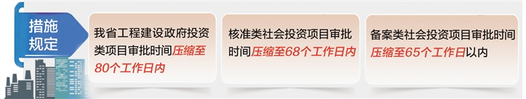 根據(jù)《若干措施》規(guī)定,河北省工程建設(shè)政府投資類項目審批時間壓縮至80個工作日內(nèi),核準(zhǔn)類社會投資項目審批時間壓縮至68個工作日內(nèi),備案類社會投資項目審批時間壓縮至65個工作日以內(nèi)。