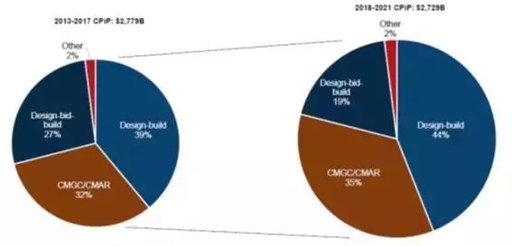 在美國工程建設(shè)市場上,主要存在三種工程建設(shè)模式:DBB 模式(DESIGN-BID-BUILD,類似于我國傳統(tǒng)工程建設(shè)模式)、CMGC/AR 模式(承包商介入工程設(shè)計階段,類似于分階段工程總承包模式)、DB 模式(DESIGN-BUILD,由一個承包商負(fù)責(zé)全部設(shè)計和施工,類似于全過程工程總承包模式)。根據(jù)美國設(shè)計建造學(xué)會和 FMI 咨詢公司的研究,2013 年到 2017 年期間,美國工程建設(shè)市場上 DB 模式占比最高,達(dá) 39%;2018 年到 2021 年的預(yù)測表明,DB 模式占比將進(jìn)一步擴(kuò)大,達(dá)到 44%。因此,在美國工程建設(shè)市場上,全過程工程總承包模式由于具備工期短、變更少、業(yè)主可控性高等優(yōu)勢,成為最重要的工程建設(shè)模式。