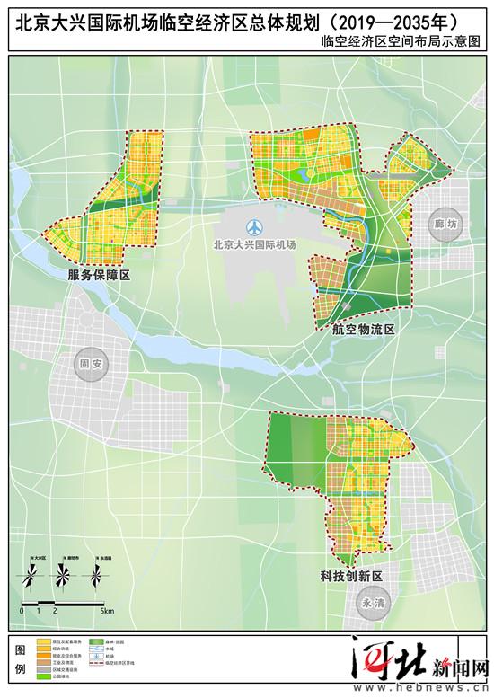 大興機場臨空經(jīng)濟區(qū)總面積約150平方公里,其中北京部分約50平方公里,河北部分約100平方公里,包括服務保障區(qū)、航空物流區(qū)和科技創(chuàng)新區(qū)共3個功能片區(qū)。航空物流區(qū)重點承載航空物流、電子商務、綜合保稅、國際會展、航企服務等功能;科技創(chuàng)新區(qū)重點承載航空導向的研發(fā)創(chuàng)新、科技孵化、高端制造、科技金融等功能;服務保障區(qū)重點承載航空科教、特色金融、休閑娛樂、科技創(chuàng)新服務等功能。