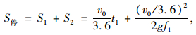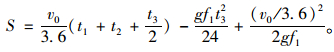 式中,v0為汽車運(yùn)行速度;f1為縱向摩阻系數(shù),依車速及路面狀況而定;g為重力加速度(9.8 m/s2);t1為駕駛者反應(yīng)時間,取2.5 s(判斷時間1.5 s,運(yùn)行時間1.0 s)。