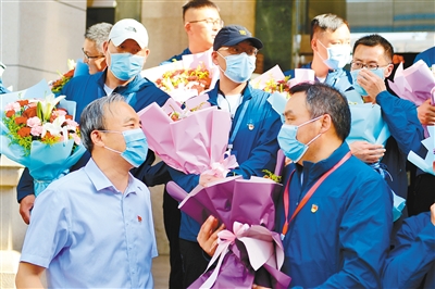下午4點(diǎn)左右,29名珠峰高程測(cè)繪隊(duì)員們?cè)诖蠹衣N首期盼下回到省測(cè)繪地理信息局。彼時(shí),留守在“家”的戰(zhàn)友和家人們?cè)缫呀?jīng)在這里等候他們。短暫的歡迎儀式后,家人和朋友們擁抱和握手成為他們表達(dá)思念的方式。這29名測(cè)繪隊(duì)員不少人已經(jīng)在珠峰待了兩三個(gè)月,有的甚至?xí)r間更長,回到西安讓他們感到格外親切。“我從過年前就去拉薩集訓(xùn)了,有大半年時(shí)間都沒有見到孩子了。太想念家人,想念西安的肉夾饃、泡饃啦!”皮膚黝黑的測(cè)繪隊(duì)員邢雄旺說。
