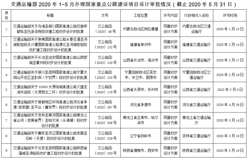 交通運輸部2020年1~5月辦理國家重點公路建設項目設計審批情況(截止2020年5月31日)
