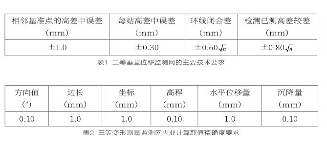 沉降觀測(cè)點(diǎn)設(shè)置于橫梁的頂面或塔柱的側(cè)面(共兩個(gè))。沉降測(cè)量采用精密水準(zhǔn)儀幾何水準(zhǔn)法和三角高程對(duì)向觀測(cè)法。按《工程測(cè)量規(guī)范》(GB 50026-2007)三等垂直位移變形測(cè)量進(jìn)行施測(cè),三等垂直位移監(jiān)測(cè)網(wǎng)的主要技術(shù)要求見(jiàn)表1。三等變形測(cè)量監(jiān)測(cè)網(wǎng)內(nèi)業(yè)計(jì)算取值精確度要求見(jiàn)表2。