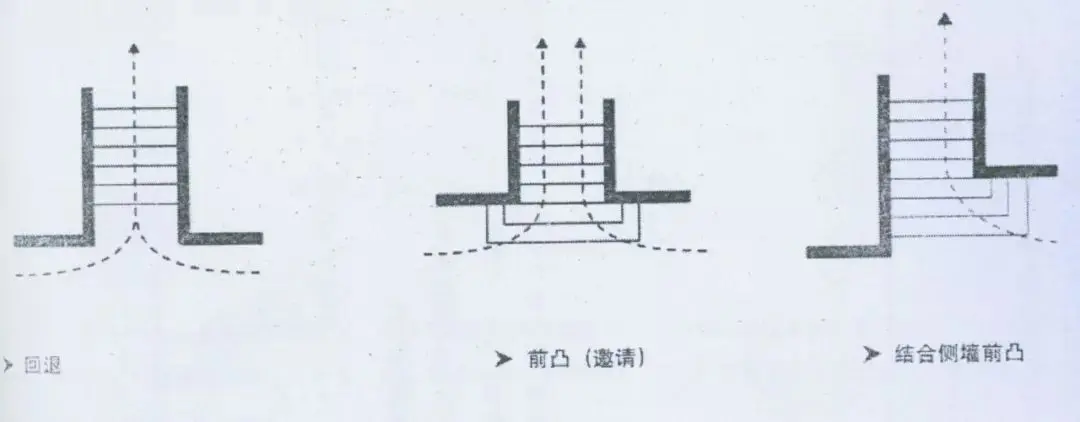 臺階以為著強(qiáng)烈的指向。在臺階上下的區(qū)域應(yīng)當(dāng)做特殊處理以表明方向的改變。因此,建筑邊沿的臺階應(yīng)當(dāng)向前延伸(公共性、邀請感)或者向后退縮(私密性、限制感),其他景觀看見宜同。