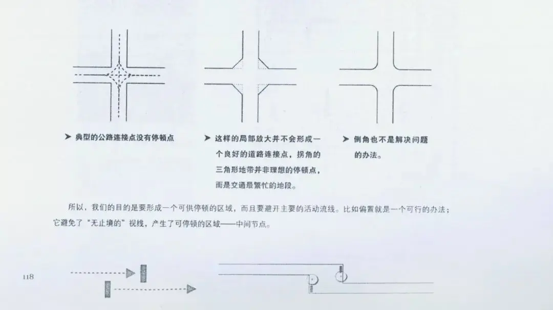 所以,我們的目的是要形成一個(gè)可供停頓的區(qū)域,而且要避開主要的活動流線。比如偏置就是一個(gè)可行的辦法;它避免了“無止境的”視線,產(chǎn)生了可停頓的區(qū)域——中間節(jié)點(diǎn)。