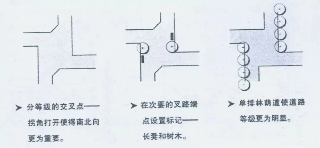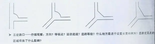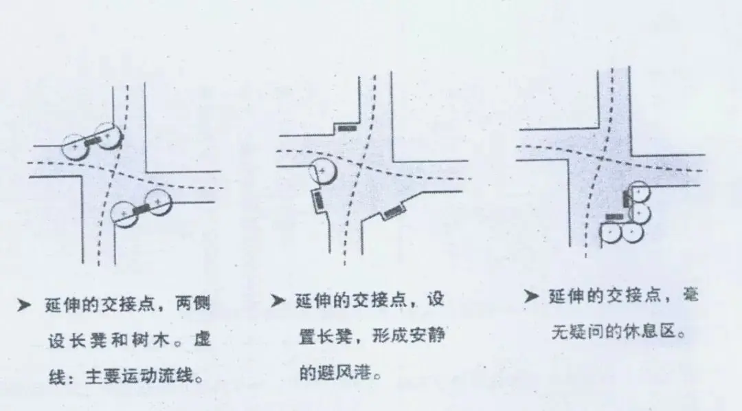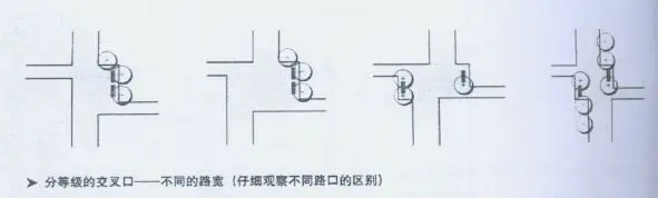 道路連接點(diǎn)與公路連接點(diǎn)不同,需要一些停頓區(qū)域。使用者在此稍作停頓,觀察選擇自己的運(yùn)動方向。因此,連接點(diǎn)需要在交叉路口加寬,有足夠的空間。但是僅僅加寬道路并不會自動產(chǎn)生一個(gè)宜人的道路連接點(diǎn)。