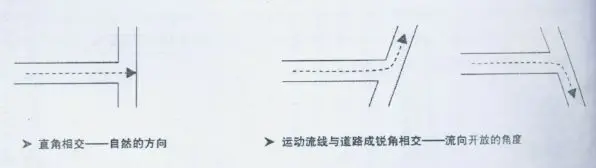 如果運(yùn)動流線與線性構(gòu)筑物(道路,空間邊界等)相交角不是自然的正交,運(yùn)動流線就會自動導(dǎo)向開放的“鈍角”一側(cè)。