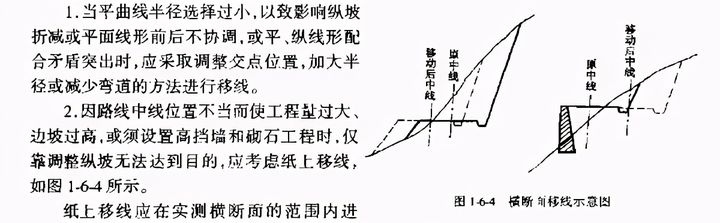 在公路定線過(guò)程中,往往由于定線時(shí)考慮不周、地形條件限制或其他原因,難免產(chǎn)生因平面中線位置不當(dāng)致使工程量過(guò)大、標(biāo)準(zhǔn)或線形不夠理想等缺點(diǎn)。此時(shí)可在分析研究已定路線平、縱、橫圖紙資料的基礎(chǔ)上,考慮移動(dòng)路線,使設(shè)計(jì)達(dá)到經(jīng)濟(jì)合理的要求,它對(duì)提高設(shè)計(jì)質(zhì)量,降低工程費(fèi)用起著一定的作用。當(dāng)路線設(shè)計(jì)出現(xiàn)以下情況時(shí),應(yīng)考慮紙上移線。