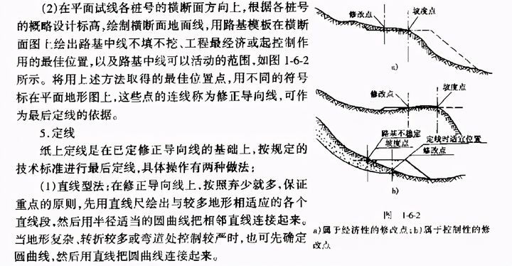 在縱斷面設(shè)計(jì)中.如果靠調(diào)整縱坡無(wú)法滿(mǎn)足要求時(shí),則應(yīng)考慮調(diào)整平面線形。若平面線形改動(dòng)不大,可根據(jù)已有路線導(dǎo)線和橫斷面資料,繪制帶狀平面圖,通過(guò)紙上移線的辦法解決;若因工程經(jīng)濟(jì)與平、縱面線形配合矛盾很大時(shí).平面線形必須作重大的改動(dòng),此時(shí)應(yīng)按定線的具體要求,通過(guò)現(xiàn)場(chǎng)改線,重新定出路線。
