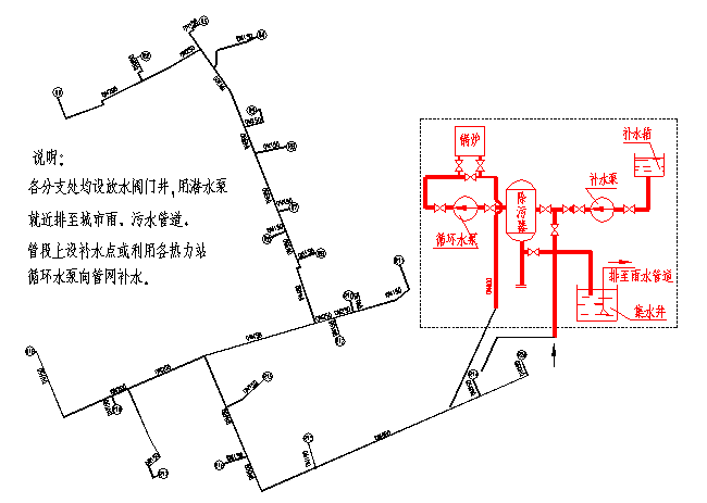 熱水網(wǎng)干線設(shè)分段閥門(mén)。輸送干線2~3km;輸配干線1~1.5km。
