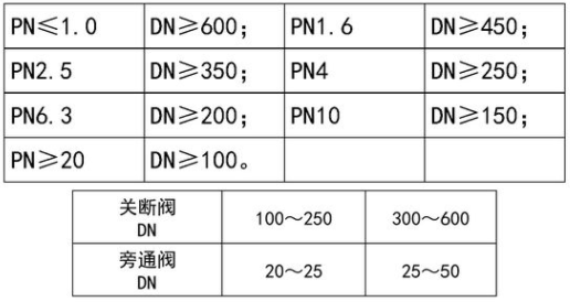 壓力≥1.6MPa,且直徑≥500mm的閘閥應(yīng)安裝旁通閥。直徑按閥門(mén)直徑十分之一選用。