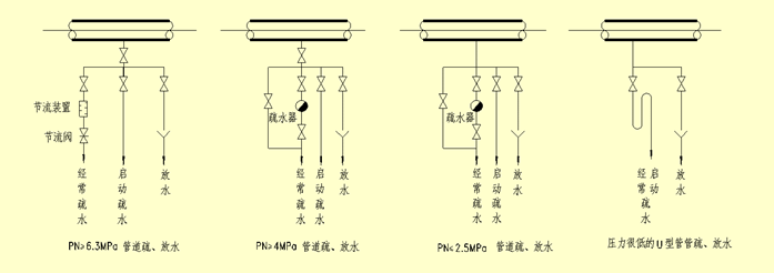 PN≥6.3MPa:管道經(jīng)常疏水宜裝設(shè)節(jié)流裝置或疏水閥,節(jié)流裝置后的閥門(mén)用節(jié)流閥;