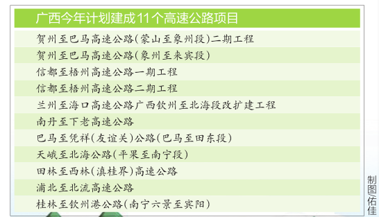 據(jù)了解,今年全區(qū)在建高速公路建設(shè)項目共76個,建設(shè)里程約5569公里,總投資約8740億元;計劃新開工龍勝至峒中公路(龍勝至融安段)、天峨至北海公路(南寧至北海段)等29條高速公路共2000公里以上,計劃建成南丹至天峨(下老)公路、田林至西林(滇桂界)公路、梧州至信都公路二期工程等11個項目。