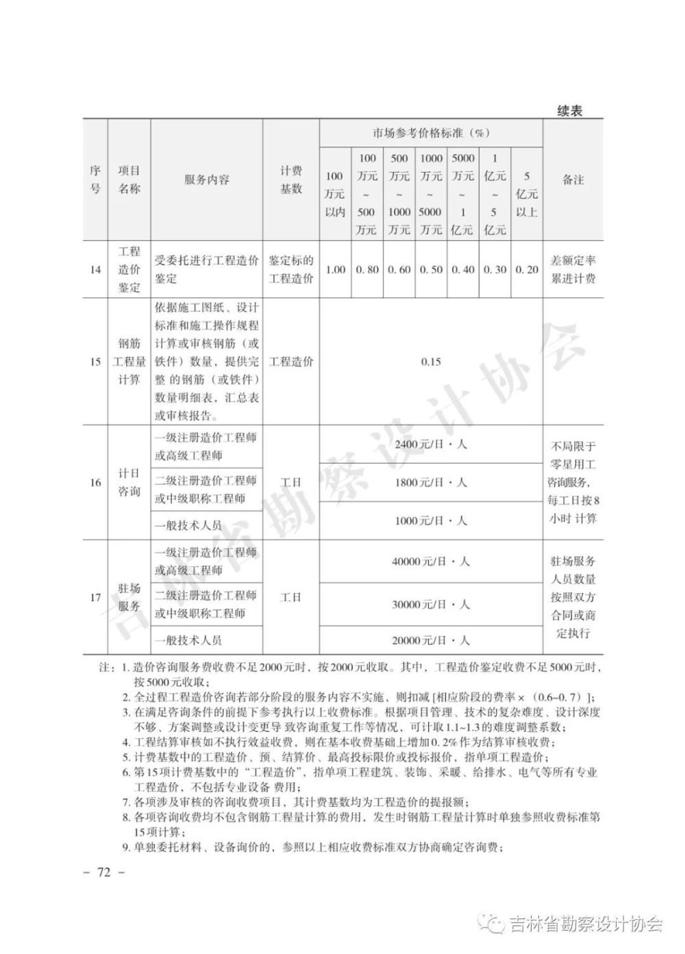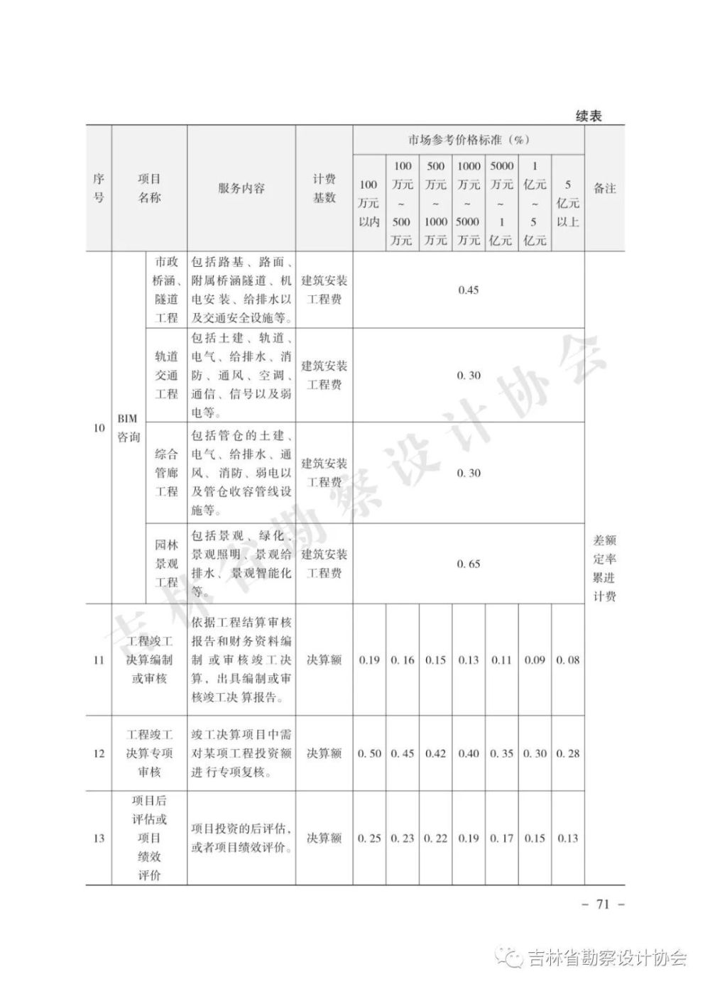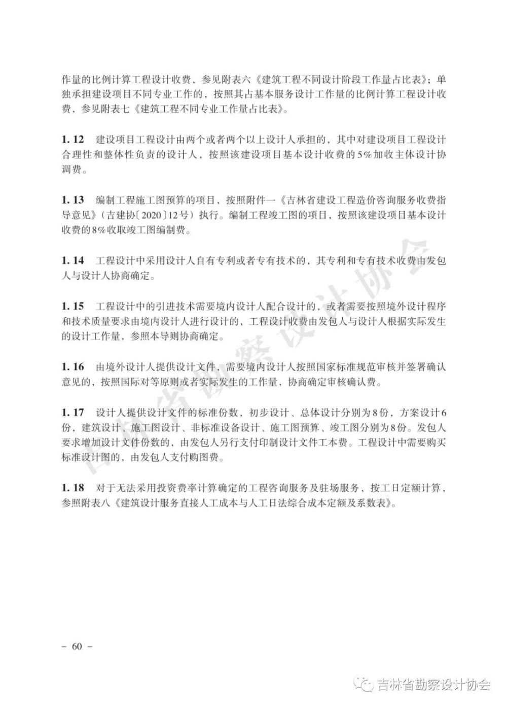 吉林省勘察設計協(xié)會通過對各地市勘察設計服務成本要素信息進行統(tǒng)計、分析及研究,在組織會員單位充分研討的基礎上,結合該省市級情況,對《吉林省建筑工程勘察設計收費指導價(試行)》予以修編,形成了《吉林省工程勘察設計收費導則》。