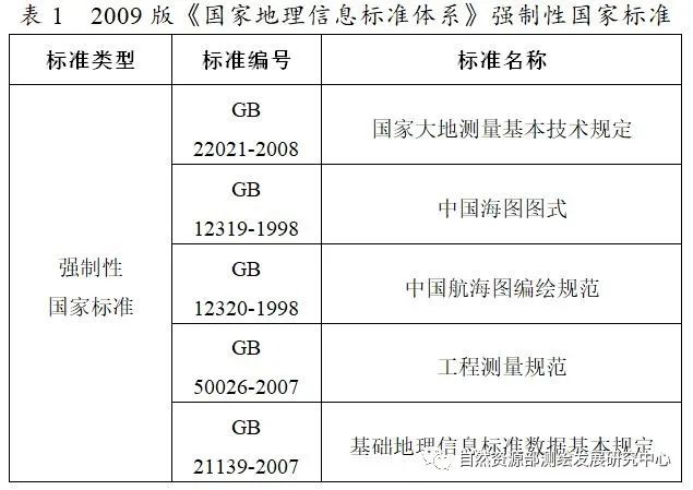 2009年原國家測繪局頒布實施了《國家地理信息標準體系》,該標準體系由地理信息基礎類標準、支持專業(yè)類標準以及專項類標準三層組成,分為通用類、數(shù)據(jù)資源類、應用服務類、環(huán)境與工具類、管理類、專業(yè)類和專項類共7大類、44小類。截至該體系頒布,收錄標準211項,其中強制性標準僅5項(見表1)。5項強制性國家標準涵蓋大地測量、海洋測繪、工程測量等方面,一定程度上保障了國家安全以及人民生命安全,但缺少人民財產(chǎn)安全相關的強制性國家標準。