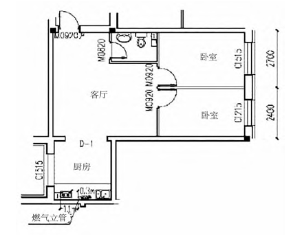 在室內(nèi)鋪設(shè)燃?xì)夤芫€(xiàn)時(shí),必須注意:①不能鋪設(shè)在潮濕或含有腐蝕性介質(zhì)的房間,也不能將其引入臥室,特別是在臥室、浴室或衛(wèi)生間里;②嚴(yán)禁通過(guò)易燃、爆炸物品、配電間、變電所、煙、風(fēng)道等場(chǎng)所;③橫穿臥房、衛(wèi)生間或地下室的管道,應(yīng)在套管內(nèi)安裝焊接;④如需放置于潮濕或有腐蝕性介質(zhì)的室內(nèi),則應(yīng)采用防腐蝕措施;⑤管道穿越樓板、樓梯平臺(tái)、墻壁、隔墻時(shí),應(yīng)將管線(xiàn)置于套管內(nèi)。⑥安裝燃?xì)庠畹姆块g凈高不宜低于2.2米,安裝熱水器的房間應(yīng)該宜大于2.4米。如圖3所示,室內(nèi)廚房豎管的設(shè)計(jì)。