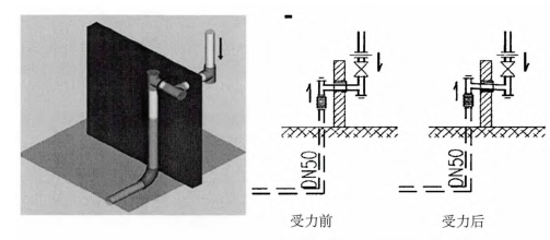 在不同的環(huán)境溫度條件下,鋼管的長(zhǎng)度是不同的,因而,受溫度的影響;豎管在熱脹冷縮過(guò)程中會(huì)發(fā)生一定的變形。在進(jìn)行立管設(shè)計(jì)時(shí),必須充分考慮環(huán)境溫差對(duì)管的影響,比如:按管子的熱膨脹系數(shù)選用適當(dāng)?shù)墓茏樱粸榱藴p小因熱應(yīng)力引起的管道變形,在豎管上設(shè)置活動(dòng)支架、補(bǔ)償裝置或增設(shè)彎頭。另外,在考慮到溫度變化對(duì)管線(xiàn)安裝的影響的情況下,還需要在施工中選取最優(yōu)的施工方案[3]。