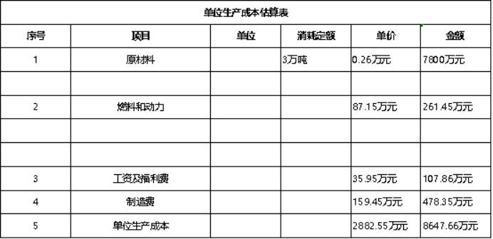 1)單位生產(chǎn)成本的估算,序號項目規(guī)格單位消耗定額單位金額