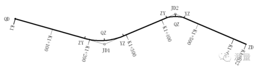 在路線平面圖中,轉(zhuǎn)折處應(yīng)注寫交點(diǎn)代號并依次編號,如JD2 表示第2個(gè)交點(diǎn)。還要注出曲線段的起點(diǎn)ZY(直圓點(diǎn))、中點(diǎn)Qz(曲中點(diǎn))、終點(diǎn)YZ(圓直點(diǎn))的位置。為了將路線上各段平曲線的幾何要素值表示清楚,一般還應(yīng)在圖中的適當(dāng)位置列出平曲線要素表。如果設(shè)置緩和曲線,則將緩和曲線與前、后段直線的切點(diǎn)分別標(biāo)記為ZH(直緩點(diǎn))和HZ(緩直點(diǎn));將圓曲線與前、后段緩和曲線的切點(diǎn)分別標(biāo)記為HY(緩圓點(diǎn))和YH(圓緩點(diǎn))。