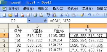 在實(shí)際工作中路線導(dǎo)線的坐標(biāo)數(shù)據(jù)都是用Excel 表格存放。這樣簡化了在繪圖時(shí)輸入坐標(biāo)的麻煩,在Excel表格中編輯導(dǎo)線點(diǎn)坐標(biāo)對,如圖11-2 所示,選中D2 欄,輸入公式“C2&" ,"&B2”,按回車鍵,系統(tǒng)自動(dòng)生成了所需要的坐標(biāo)對。選中 D2欄,將光標(biāo)指向第二欄右下角,系統(tǒng)出現(xiàn)黑色小十字標(biāo)記,按住鼠標(biāo)左鍵向下拖動(dòng)十字標(biāo)記,一直到ZD,D2欄就自動(dòng)生成了對調(diào)后的各交點(diǎn)的坐標(biāo)對,并將他們依次復(fù)制下來。