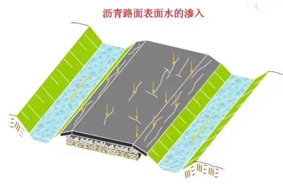 路面結(jié)構(gòu)內(nèi)部水的危害:浸濕各結(jié)構(gòu)層材料和路基土,易造成無粘結(jié)粒狀材料和地基土的強度降低;使水泥混凝土路面產(chǎn)生唧泥,隨之出現(xiàn)錯臺、開裂和整個路肩破壞;進入空隙的自由水在行車荷載的作用下,會形成高孔隙水壓力和高流速的水流,引起路面基層的細顆粒產(chǎn)生唧泥,結(jié)果失去支承;在冰凍深度大于路面厚度的地方,高地下水位會造成凍脹,并在凍融期間降低承載能力;水使凍脹土產(chǎn)生不均勻凍脹;與水經(jīng)常接觸將使瀝青混合料剝落,影響瀝青混凝土耐久性和產(chǎn)生龜裂。