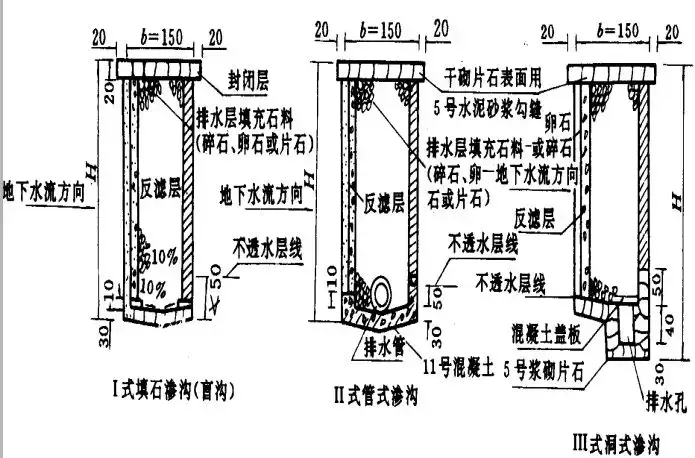 滲溝構(gòu)造:由排水層(石縫,管,洞),反濾層和封閉層所組成。封閉層:防止地面水的下滲(漿砌片石)。反濾層:匯集水流,防止水層中的土粒堵塞排水層,由大小均勻的砂石材料,分層填埋。