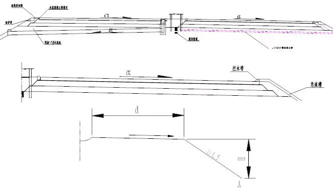 采用水泥混凝土預制塊攔水帶時,應(yīng)避免預制塊影響路面內(nèi)部水的排泄。攔水帶的頂面應(yīng)略高于過水斷面的設(shè)計水面高(水深),按設(shè)計流量公式計算確定。