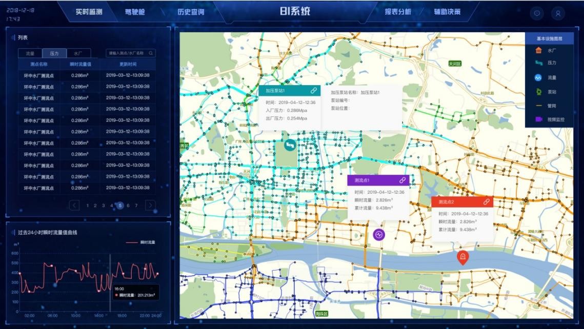 安裝物聯(lián)感知設(shè)備,對監(jiān)測點數(shù)據(jù)如壓力、流量、水質(zhì)等進行實時采集、在線監(jiān)測。實現(xiàn)生成監(jiān)測點歷史監(jiān)測數(shù)據(jù)相關(guān)報表、趨勢曲線等。